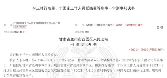 2021年3月,李玉峰因“個(gè)人原因”從蘭州銀行辭職。從判決書透露的時(shí)間線來看,2021年1月18日,李玉峰已被蘭州市西固區(qū)監(jiān)察委員會(huì)采取留置措施,并于2021年7月16日被刑事拘留,同年7月22日被執(zhí)行逮捕。