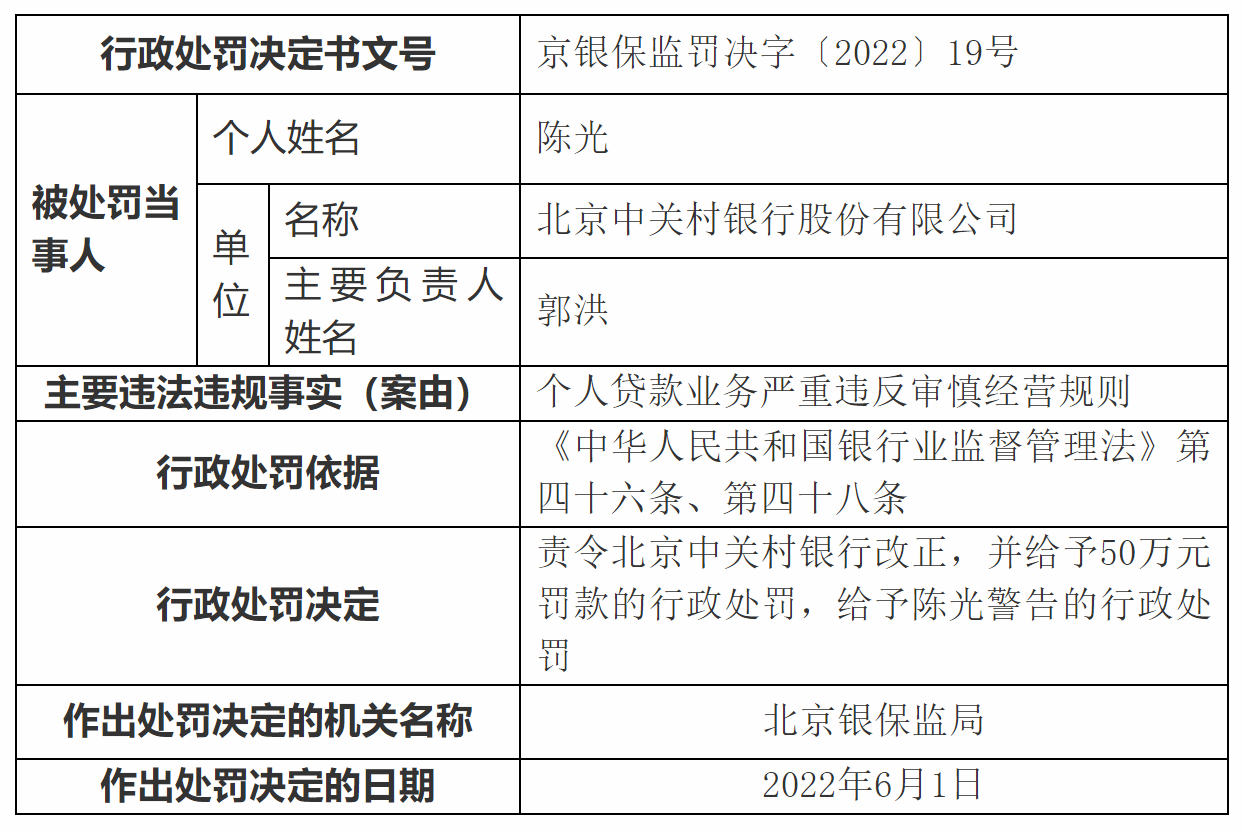 據(jù)銀保監(jiān)會(huì)網(wǎng)站消息,近日北京銀保監(jiān)局對(duì)北京中關(guān)村銀行開(kāi)出罰單,針對(duì)個(gè)人貸款業(yè)務(wù)嚴(yán)重違反審慎經(jīng)營(yíng)規(guī)則的違法違規(guī)行為,責(zé)令該行改正,罰款50萬(wàn)元,并對(duì)責(zé)任人陳光進(jìn)行警告。