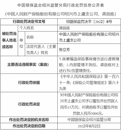 近日,中國銀保監(jiān)會浙江監(jiān)管局官網(wǎng)披露一則行政處罰信息。信息顯示,中國人民財產(chǎn)保險股份有限公司紹興市上虞支公司存在兩項違法違規(guī)事實:其一,故意編造保險事故情節(jié)進(jìn)行虛假理賠;其二,內(nèi)部管理不到位。而龔邑棟對第二項違規(guī)事實負(fù)管理責(zé)任。