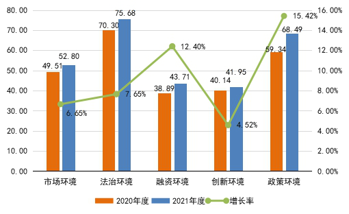 從五個(gè)一級指標(biāo)來看,各參評城市市場環(huán)境、法治環(huán)境、融資環(huán)境、創(chuàng)新環(huán)境和政策環(huán)境整體均有所改善,得分均值分別為52.80、75.68、43.71、41.95和68.49,分別比上次評估增長6.65%、7.65%、12.40%、4.52%和15.42%。