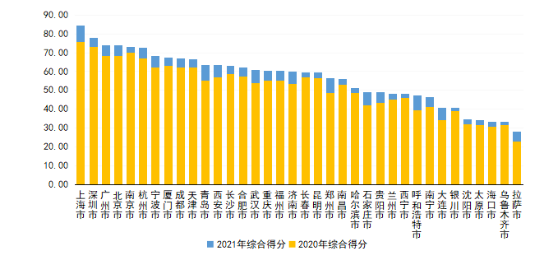 評估顯示,2021年度各參評城市綜合得分均值為56.53,比上次評估得分均值(51.63)增長9.49%。所有參評城市綜合得分較上次均有所提升,超過5%的城市有33個(gè),占比達(dá)91.67%;超過10%的城市有12個(gè),占比達(dá)33.33%。