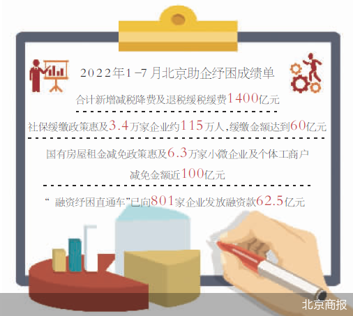 “截至8月1日,北京今年合計(jì)新增減稅降費(fèi)及退稅緩稅緩費(fèi)1400億元;社保緩繳政策惠及3.4萬家企業(yè)約115萬人,緩繳金額達(dá)到60億元;國有房屋租金減免政策惠及6.3萬家小微企業(yè)及個(gè)體工商戶,減免金額近100億元;“融資紓困直通車”已向801家企業(yè)發(fā)放融資款62.5億元?!贝鞣f介紹道。