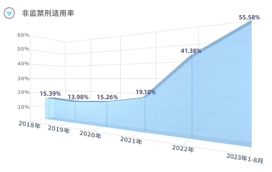 從非監(jiān)禁刑的適用情況看,輕罪案件被宣告緩刑、判處管制、單處罰金等非監(jiān)禁刑的比例呈現(xiàn)上升趨勢(shì),近兩年來尤為明顯。2018年非監(jiān)禁刑適用率僅為15.39%,2022年該比例則上升至41.38%,較2018年上升26個(gè)百分點(diǎn)。今年1-8月份,非監(jiān)禁刑的適用率則上升至55.58%。