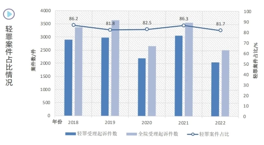 2018年至2022年,海淀區(qū)檢察院平均每年受理輕罪案件2600余件3300余人。除2020年和2022年因受疫情等因素影響,案件數(shù)量有所下降外,2018年、2019年、2021年三年間,輕罪案件數(shù)量逐年增加,以件數(shù)計(jì)平均每年增長(zhǎng)3%,以人數(shù)計(jì)平均每年增長(zhǎng)5%。與此同時(shí),輕罪案件件數(shù)在整體刑事案件中的占比維持在81%至86%之間,平均占比達(dá)84%,輕罪案件人數(shù)占比維持在74%至83%之間,平均占比達(dá)78%。從上述數(shù)據(jù)可以看出,輕罪案件數(shù)量和占比明顯處于高位,并呈現(xiàn)上升態(tài)勢(shì),與此同時(shí),重罪案件占比已明顯下降,以輕罪為主的刑事犯罪結(jié)構(gòu)基本形成。