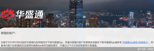 3月8日,華盛證券宣布,自當(dāng)日起在中國境內(nèi)應(yīng)用商店下架華盛通App。華盛證券表示,此次調(diào)整不影響存量境內(nèi)客戶繼續(xù)使用華盛通App。存量境內(nèi)客戶仍可通過華盛通App進行交易,相關(guān)服務(wù)和業(yè)務(wù)均不受影響。此外,公告還指出,未來華盛證券將繼續(xù)服務(wù)好所有存量境內(nèi)客戶,為存量境內(nèi)客戶提供優(yōu)質(zhì)產(chǎn)品、服務(wù)及客戶體驗。