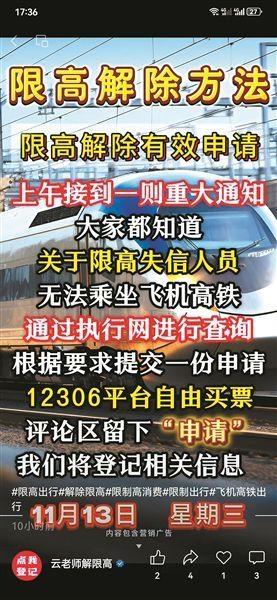 個別律所認(rèn)證賬號發(fā)作品 稱提供解除“限高”服務(wù)
