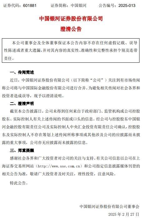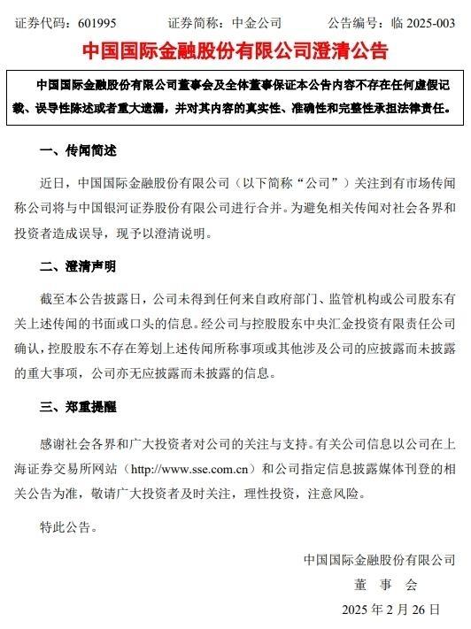 中國(guó)國(guó)際金融股份有限公司(下稱“中金公司”,601995.SH,03908.HK)與中國(guó)銀河證券股份有限公司(下稱“中國(guó)銀河”,601881.SH,06881.HK)雙雙否認(rèn)合并傳聞。