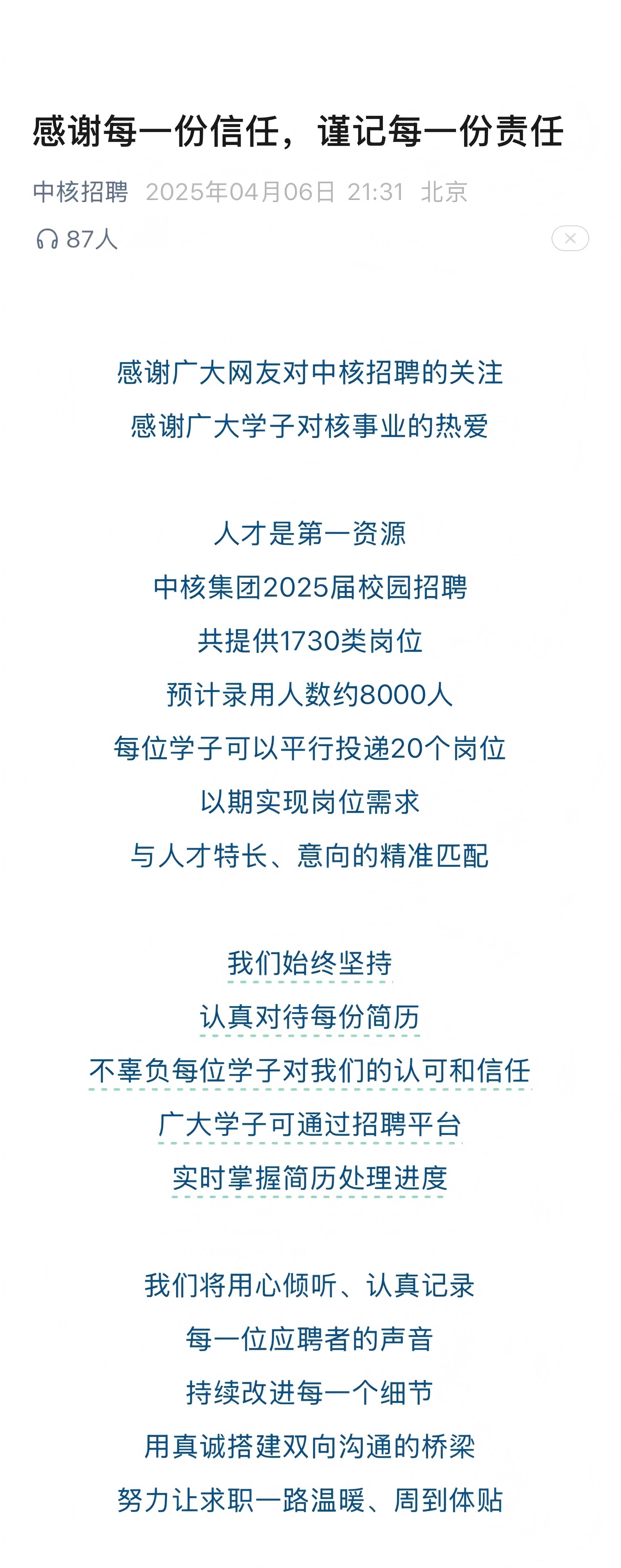 4月6日晚,中核招聘官微發(fā)布聲明《感謝每一份信任,謹(jǐn)記每一份責(zé)任》,回應(yīng)收到一百多萬份簡歷:感謝廣大網(wǎng)友對中核招聘的關(guān)注,感謝廣大學(xué)子對核事業(yè)的熱愛。人才是第一資源,中核集團(tuán)2025屆校園招聘,共提供1730類崗位,預(yù)計(jì)錄用人數(shù)約8000人,每位學(xué)子可以平行投遞20個(gè)崗位,以期實(shí)現(xiàn)崗位需求與人才特長、意向的精準(zhǔn)匹配。