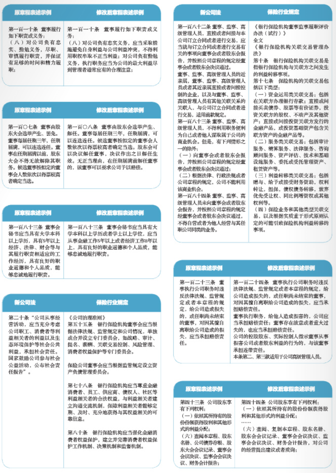 新公司法第一百八十二條至第一百八十四條對(duì)董事、監(jiān)事、高級(jí)管理人員忠實(shí)義務(wù)作出細(xì)致規(guī)定,分別涉及自我交易、謀取公司商業(yè)機(jī)會(huì)、競(jìng)業(yè)等方面?!躲y行保險(xiǎn)機(jī)構(gòu)關(guān)聯(lián)交易管理辦法》對(duì)保險(xiǎn)機(jī)構(gòu)關(guān)聯(lián)交易的類型進(jìn)行了具體羅列,還對(duì)關(guān)聯(lián)交易的交易金額、重大程度作出規(guī)定,并明確保險(xiǎn)公司的董事會(huì)應(yīng)當(dāng)設(shè)立關(guān)聯(lián)交易控制委員會(huì),董事會(huì)對(duì)關(guān)聯(lián)交易管理承擔(dān)最終責(zé)任,這些都為保險(xiǎn)公司關(guān)聯(lián)交易管理的具體執(zhí)行提供了依據(jù)。筆者認(rèn)為,保險(xiǎn)機(jī)構(gòu)在修訂章程時(shí),應(yīng)按照前述更為嚴(yán)格的規(guī)定完善諸如關(guān)聯(lián)交易等內(nèi)容。