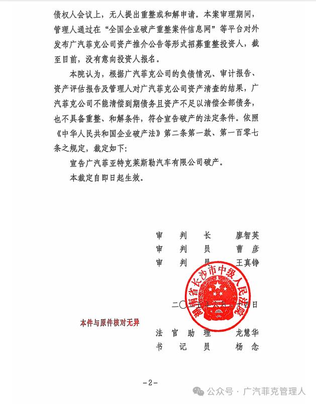 因廣汽菲克公司已無(wú)重整可能,根據(jù)部分債權(quán)人意見,經(jīng)債權(quán)人委員會(huì)討論,管理人已經(jīng)申請(qǐng)長(zhǎng)沙中院裁定宣告廣汽菲克公司破產(chǎn)。附:長(zhǎng)沙中院《民事裁定書》(2022)湘01破214號(hào)-2號(hào)。