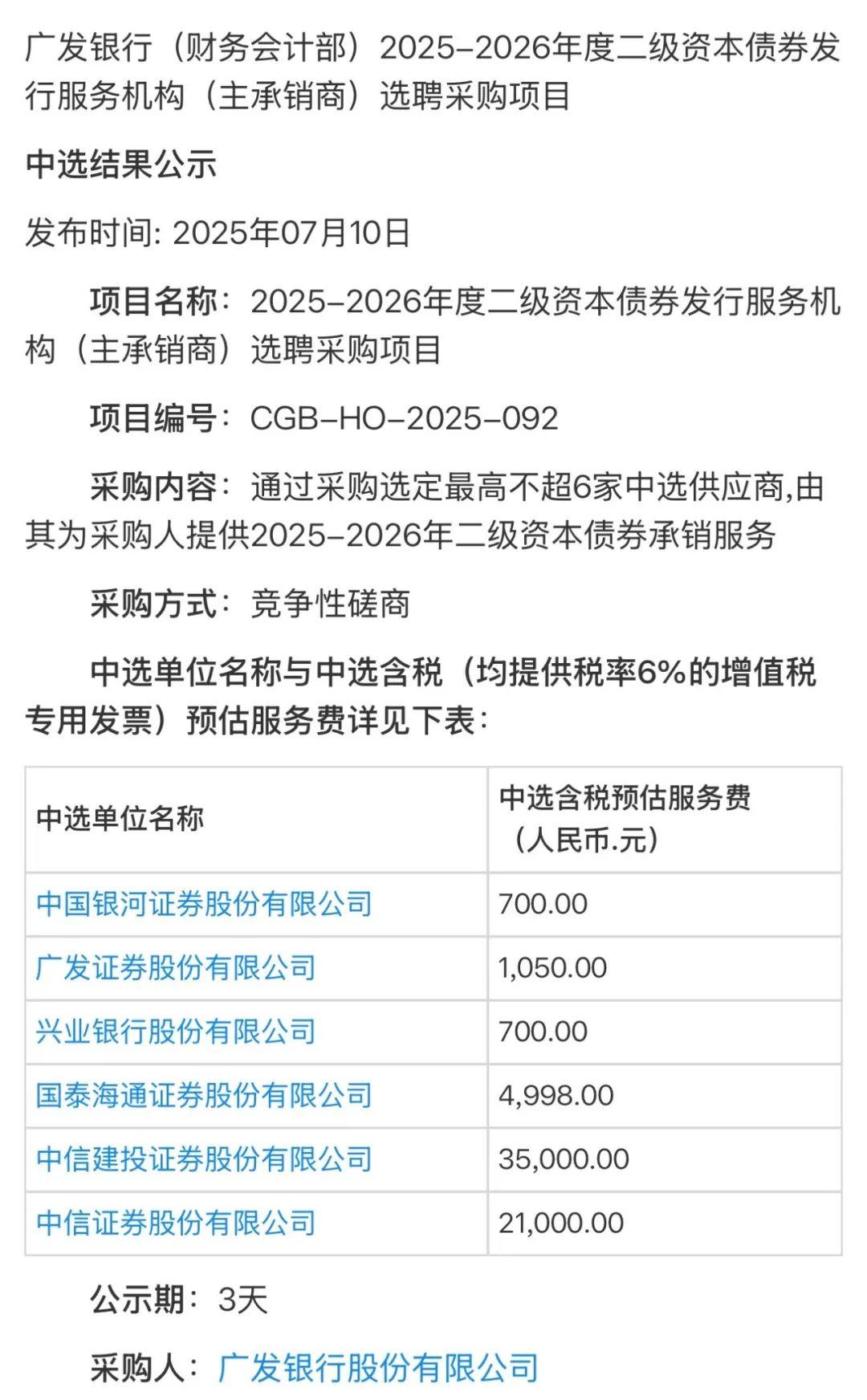 7月10日,廣發(fā)銀行對(duì)上述項(xiàng)目中選結(jié)果進(jìn)行公示,中國(guó)銀河證券、廣發(fā)證券、興業(yè)銀行、國(guó)泰海通證券、中信建投證券、中信證券等6家機(jī)構(gòu)中選,承銷(xiāo)服務(wù)費(fèi)總額63448元,提供稅率6%的增值稅專(zhuān)用發(fā)票。