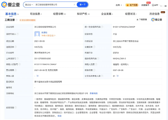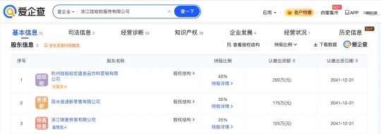 浙江娃哈哈服飾有限公司成立于2021年9月,法定代表人為鄭道哈,注冊(cè)資本500萬(wàn)元人民幣,經(jīng)營(yíng)范圍包括服裝服飾批發(fā)、服裝服飾零售、箱包銷售等,由杭州娃哈哈宏盛食品飲料營(yíng)銷有限公司、麗水音速新零售有限公司、浙江銀基貿(mào)易有限公司分別持股40%、35%、25%。