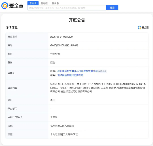 愛(ài)企查App顯示,近日,杭州娃哈哈宏盛食品飲料營(yíng)銷有限公司與浙江娃哈哈服飾有限公司相關(guān)合同糾紛案件新增開庭公告,原告為杭州娃哈哈宏盛食品飲料營(yíng)銷有限公司,該案件將于8月1日在杭州市蕭山區(qū)人民法院開庭審理。