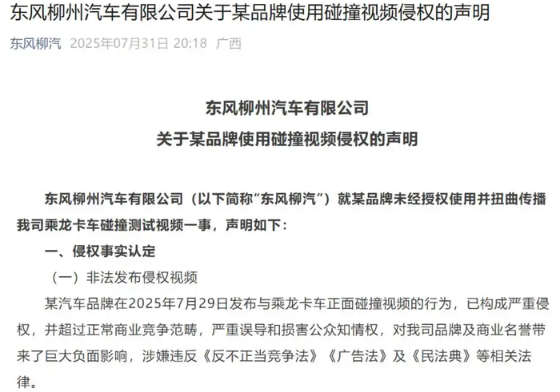 7月31日晚間,東風(fēng)柳州汽車(chē)有限公司(簡(jiǎn)稱(chēng)“東風(fēng)柳汽”)發(fā)布關(guān)于某品牌未經(jīng)授權(quán)使用并扭曲傳播東風(fēng)柳汽旗下商用車(chē)品牌乘龍卡車(chē)碰撞視頻侵權(quán)的聲明。