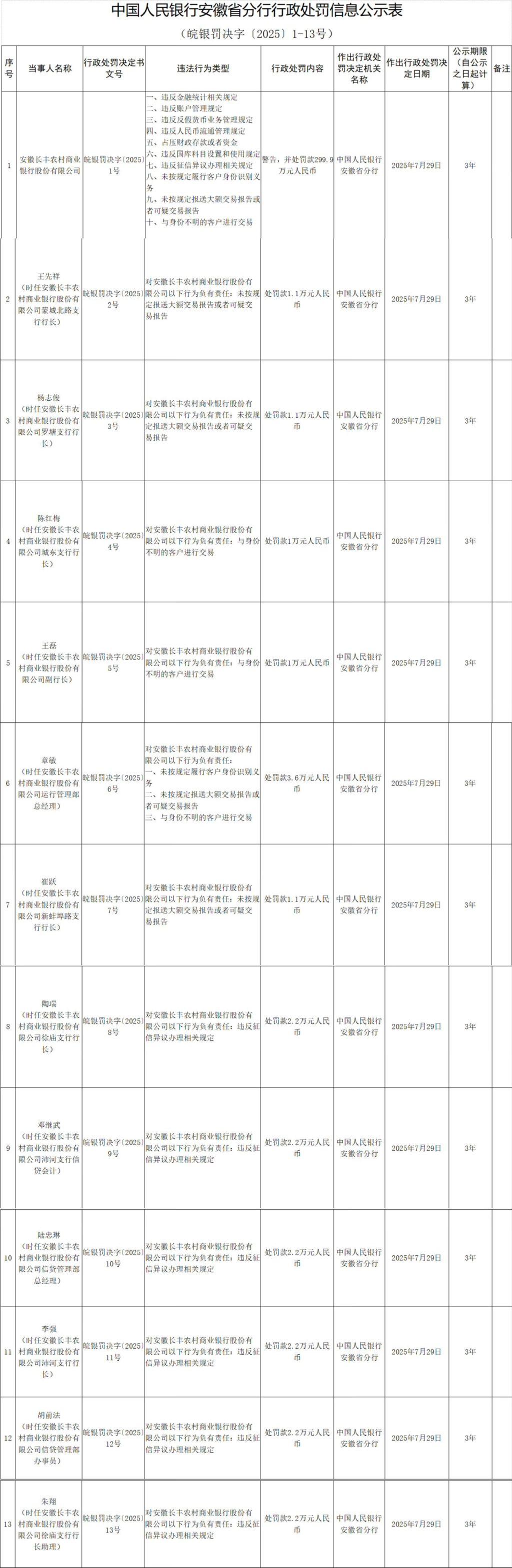 具體看,時(shí)任長(zhǎng)豐農(nóng)商行蒙城北路支行行長(zhǎng)王先祥、時(shí)任長(zhǎng)豐農(nóng)商行羅塘支行行長(zhǎng)楊志俊、時(shí)任長(zhǎng)豐農(nóng)商行新蚌埠路支行行長(zhǎng)崔躍被處罰款1.1萬(wàn)元,對(duì)長(zhǎng)豐農(nóng)商行未按規(guī)定報(bào)送大額交易報(bào)告或者可疑交易報(bào)告負(fù)有責(zé)任;