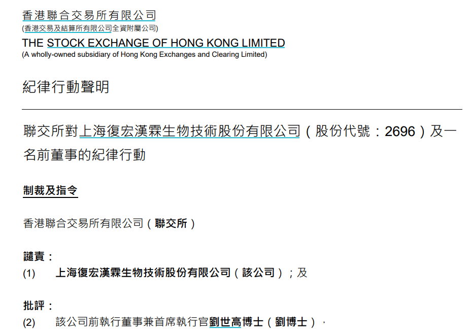 9月2日,復宏漢霖(2696.HK)公告了一份聯(lián)交所對公司及一名前董事的紀律行動聲明。文件顯示,復宏漢霖受到港交所譴責,而公司前執(zhí)行董事兼CEO劉世高受到批評。港交所要求劉世高接受26小時有關(guān)監(jiān)管和法律議題以及上市規(guī)則合規(guī)事宜的培訓,才能再獲委任為任何已于或?qū)⒂诼?lián)交所上市的公司董事。