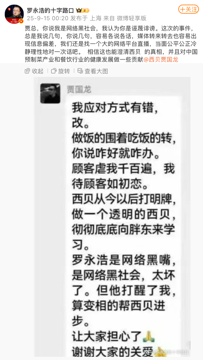 近日,西貝餐飲與羅永浩就預(yù)制菜引發(fā)的爭(zhēng)論在網(wǎng)絡(luò)上持續(xù)發(fā)酵。14日晚間,西貝創(chuàng)始人賈國(guó)龍此前表態(tài)的完整截圖流出,其中除了提到西貝從今以后要打明牌、向胖東來學(xué)習(xí)外,還將羅永浩稱為網(wǎng)絡(luò)黑嘴、網(wǎng)絡(luò)黑社會(huì)。對(duì)此,羅永浩今日凌晨在社交平臺(tái)表示,本次事件中雙方總是各說各話,媒體轉(zhuǎn)來轉(zhuǎn)去也容易出現(xiàn)信息偏差。他提議,雙方找一個(gè)大型網(wǎng)絡(luò)平臺(tái)直播,當(dāng)面對(duì)話。