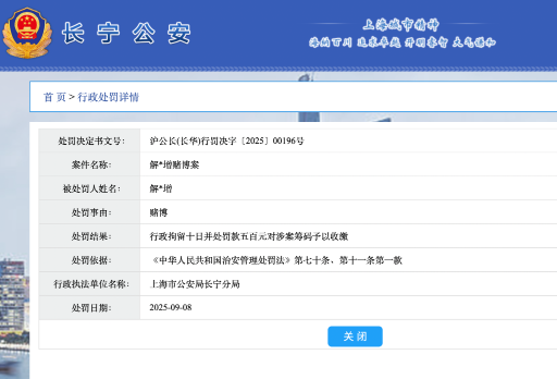 上海市公安局長寧分局官網(wǎng)公開的行政處罰信息顯示,9月8日,一位姓名為“解某增”的人員因參與賭博被上海市警方帶走,處罰結(jié)果為“行政拘留十日,并處罰款五百元,對(duì)涉案籌碼予以收繳”。