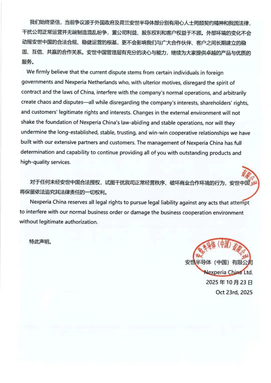 10月23日,安世半導(dǎo)體中國有限公司發(fā)布聲明稱,近期荷蘭總部單方面免去張秋明銷售市場部副總裁職務(wù)的決定,在中國法域下不發(fā)生法律效力。