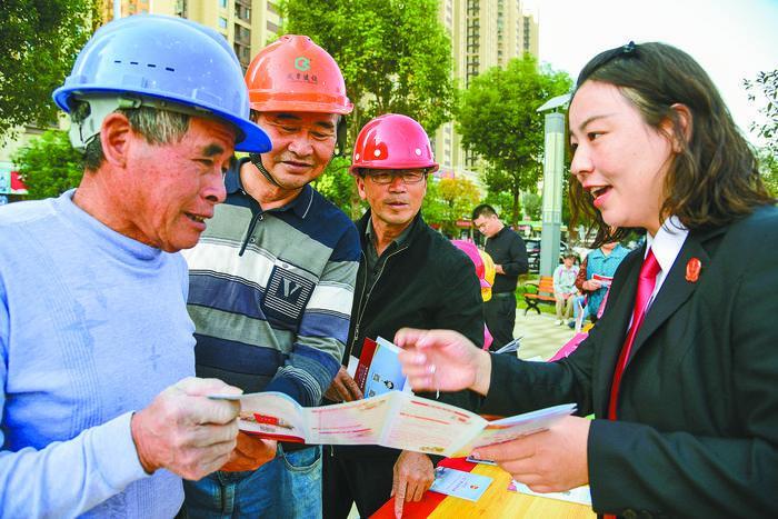 近日,江蘇省鎮(zhèn)江市相關(guān)部門(mén)聯(lián)合開(kāi)展“送法進(jìn)工地,法援伴我行”活動(dòng),工作人員和律師走進(jìn)轄區(qū)建設(shè)工地,向外來(lái)務(wù)工人員普及《中華人民共和國(guó)民法典》《保障農(nóng)民工工資支付條例》等法律法規(guī)知識(shí)和維權(quán)援助方法,增強(qiáng)工人們的法治意識(shí)。圖為法院工作人員為外來(lái)務(wù)工人員講解法律維權(quán)知識(shí)。(石玉成)