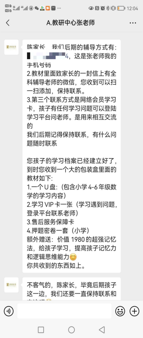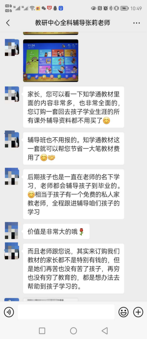 隗卓然指出,這類消費陷阱一般是虛構(gòu)聊天記錄展示出單量,利用消費者急迫、從眾的心理和信息差來催促消費者下單,比如銷售人員提供客戶孩子學(xué)習(xí)成績提升的各種截圖信息再結(jié)合“訂購一套知學(xué)通教材,孩子學(xué)習(xí)生涯所有的課外輔導(dǎo)資料都不用買”的“一勞永逸”型話術(shù),令家長們沖動付款。