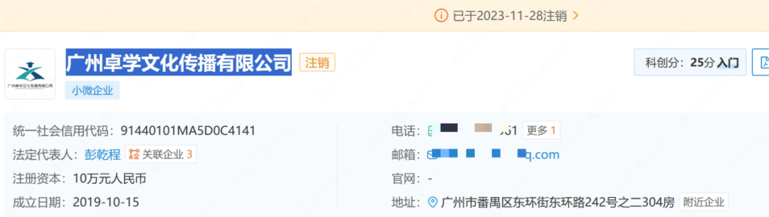 莫女士則通過查詢寄送學(xué)習(xí)機的快遞,獲取了“廣州教研中心”的地址和電話。信息顯示,這是一個名為“廣州卓學(xué)文化傳播有限公司”的小微企業(yè),但是于2023年11月已經(jīng)注銷。