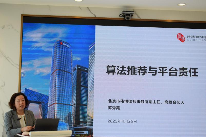 偉博律所副主任范秀霞律師以《算法推薦與平臺(tái)責(zé)任》為題,結(jié)合避風(fēng)港原則、紅旗原則等法律規(guī)定,對(duì)算法推薦服務(wù)提供者應(yīng)承擔(dān)的注意義務(wù)點(diǎn)進(jìn)行了提示;結(jié)合司法審判中的具體案例,明確平臺(tái)主動(dòng)審查與被動(dòng)審查的區(qū)別,合理界定了算法推薦服務(wù)者的責(zé)任邊界。范秀霞認(rèn)為,可以通過(guò)運(yùn)用技術(shù)手段、完善內(nèi)部制度建設(shè)等方式,實(shí)現(xiàn)平臺(tái)與權(quán)利人的互利共贏,共同營(yíng)造健康的網(wǎng)絡(luò)內(nèi)容生態(tài)。