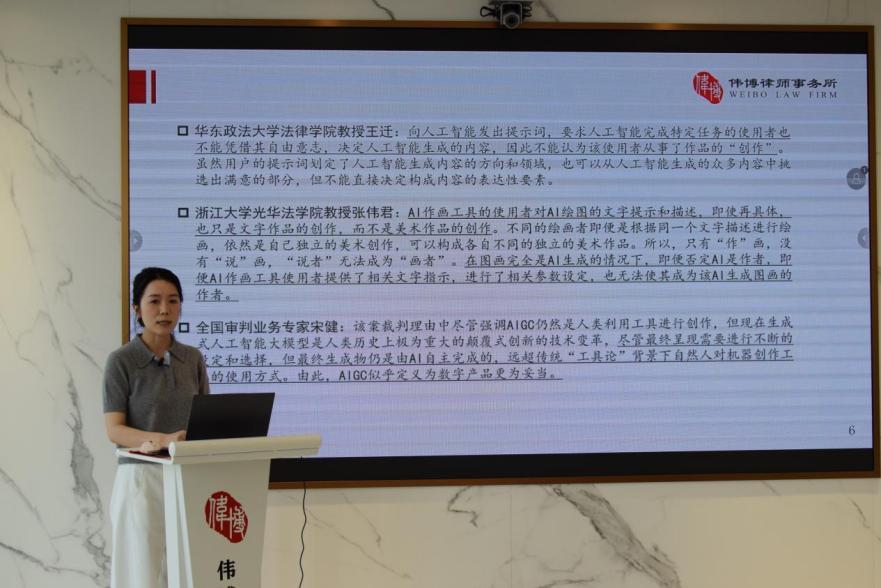 偉博律所律師曹琳娜以《AIGC司法裁判最新動(dòng)向》為題,聚焦行業(yè)前沿,深入分析了近期備受關(guān)注的“春風(fēng)案”和“蝴蝶椅案”背后的核心問(wèn)題。曹琳娜認(rèn)為,司法實(shí)踐需認(rèn)真審視AI軟件用戶與AI軟件的交互關(guān)系,審慎考量作品性質(zhì),并從法律要件的角度進(jìn)行分析定性,而“蝴蝶椅案”對(duì)AIGC產(chǎn)業(yè)的發(fā)展和對(duì)AIGC產(chǎn)物的應(yīng)用與保護(hù)作出了有益探索。