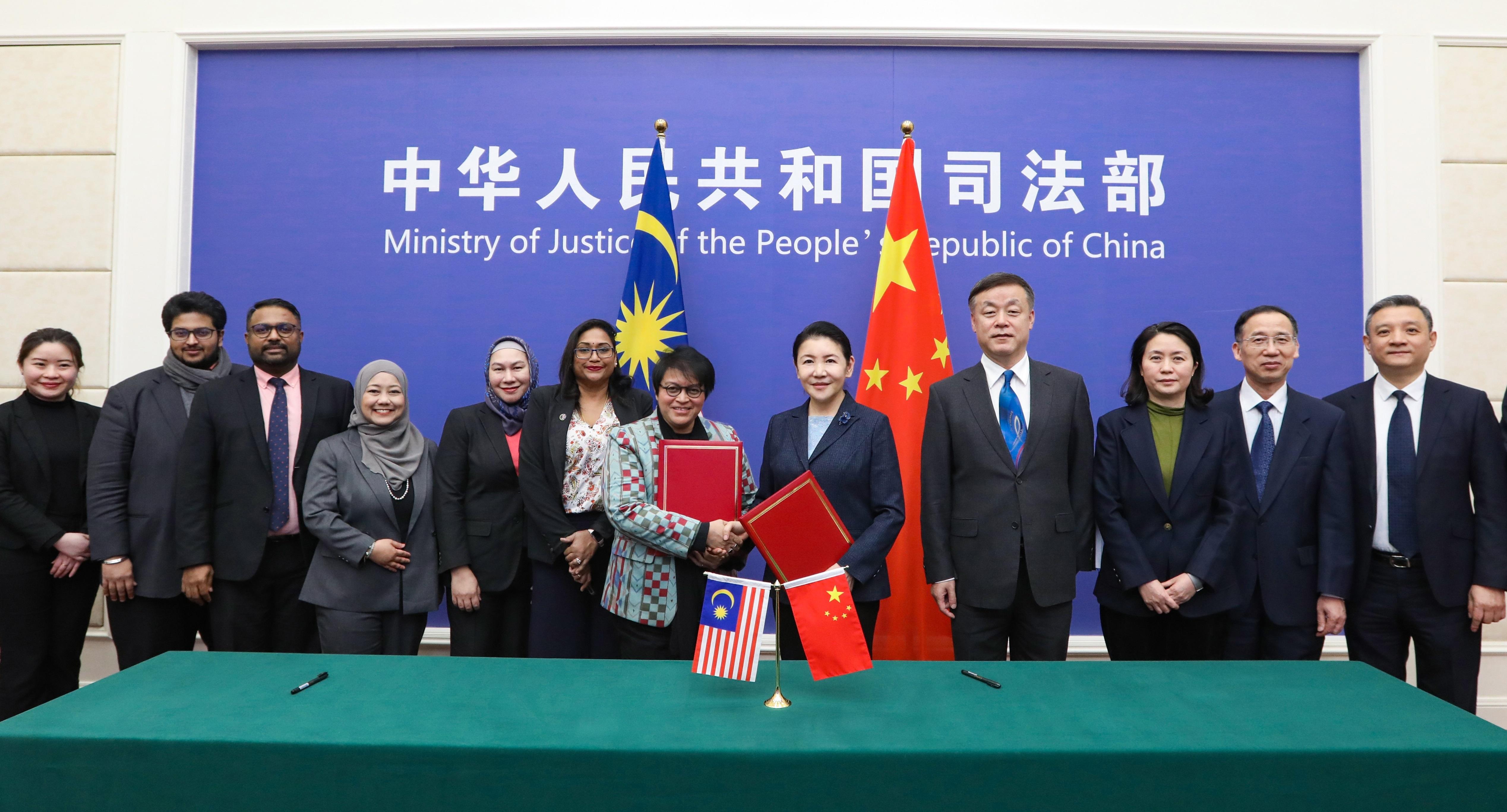 司法部部長(zhǎng)賀榮和馬來(lái)西亞總理府法律及體制改革部長(zhǎng)阿莎麗娜簽署《中華人民共和國(guó)司法部和馬來(lái)西亞總理府法律事務(wù)辦公室合作意向書(shū)》。