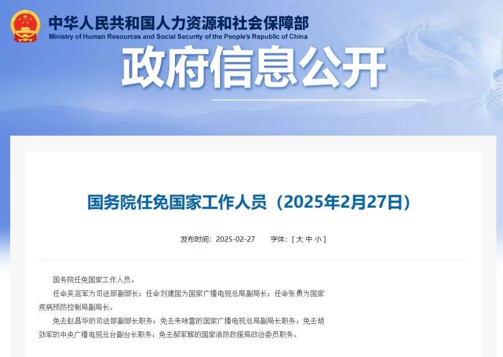 任命吳言軍為司法部副部長(zhǎng);任命劉建國(guó)為國(guó)家廣播電視總局副局長(zhǎng);任命張勇為國(guó)家疾病預(yù)防控制局副局長(zhǎng)。
