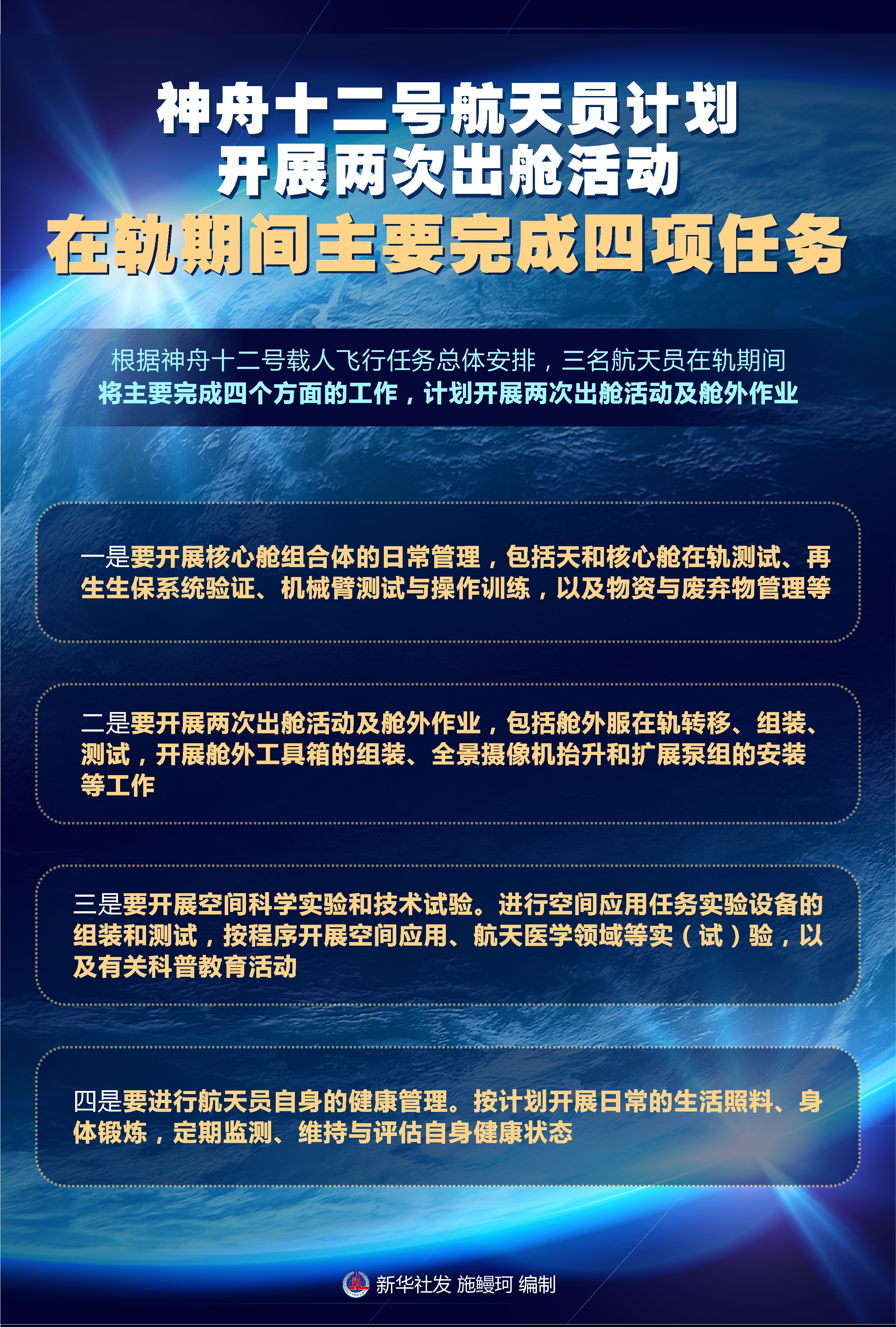 圖表:神舟十二號(hào)航天員計(jì)劃開展兩次出艙活動(dòng) 在軌期間主要完成四項(xiàng)任務(wù)