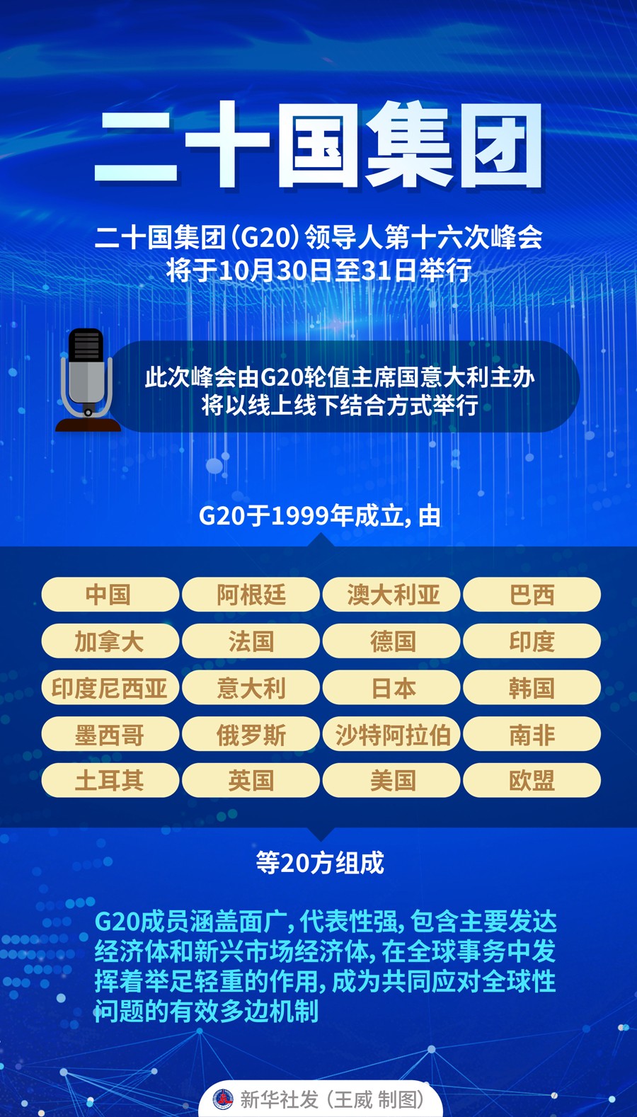 二十國集團(tuán)(G20)領(lǐng)導(dǎo)人第十六次峰會將于10月30日至31日舉行。此次峰會由G20輪值主席國意大利主辦,將以線上線下結(jié)合方式舉行。