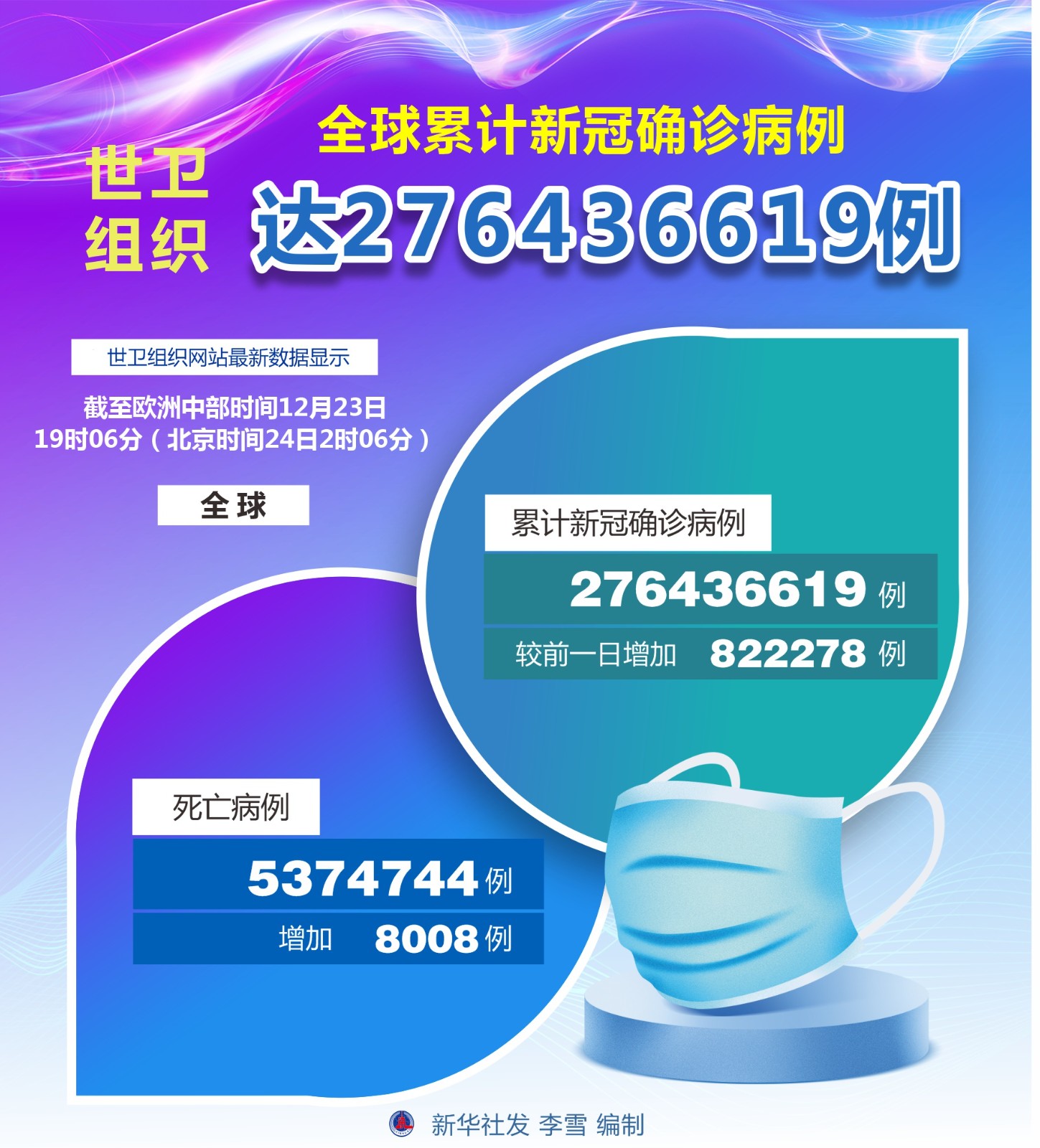 世界衛(wèi)生組織12月23日公布的最新數(shù)據(jù)顯示,全球累計新冠確診病例達276436619例。