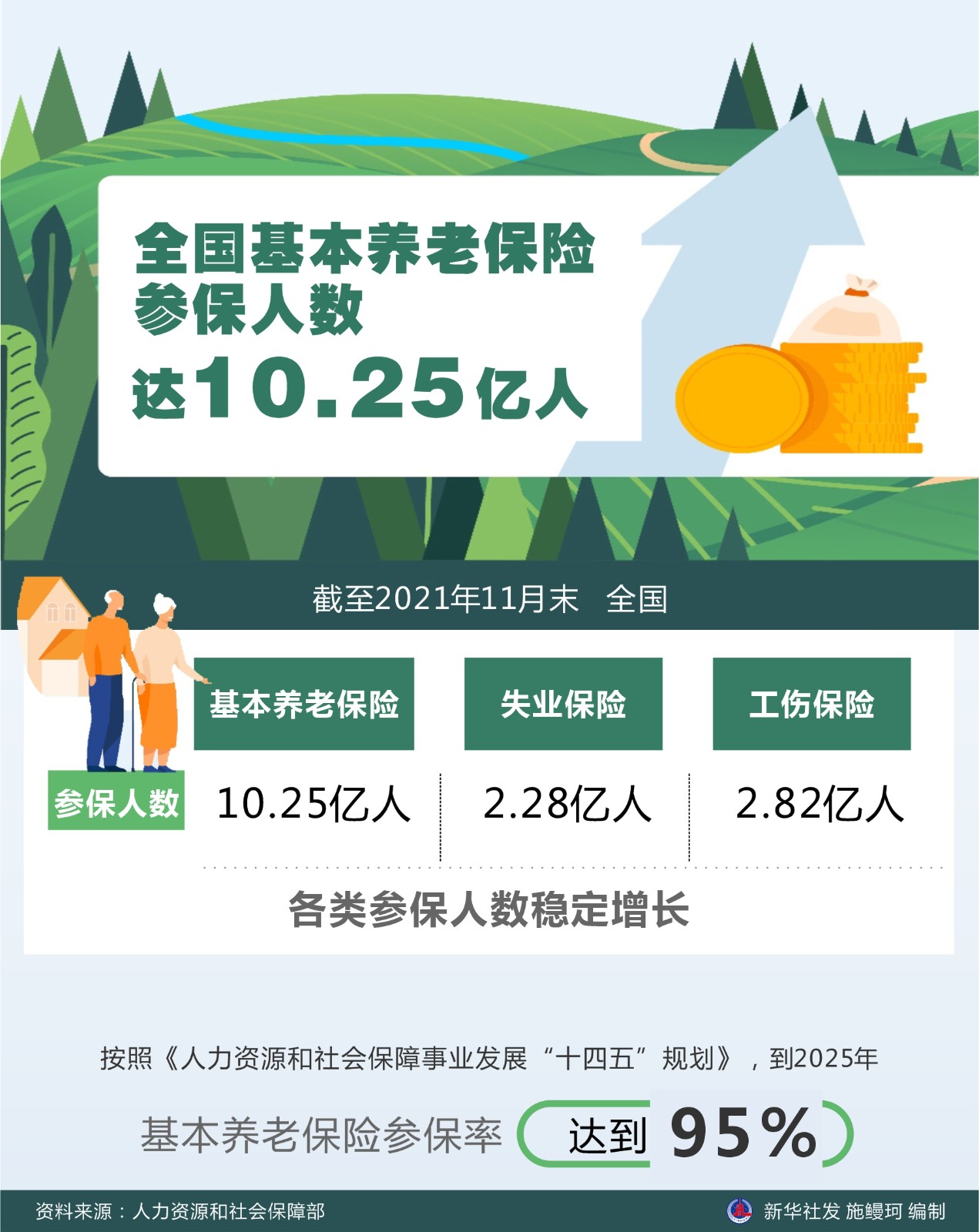 記者近日從人力資源和社會保障部獲悉,截至2021年11月末,全國基本養(yǎng)老保險、失業(yè)保險、工傷保險參保人數(shù)分別為10.25億人、2.28億人、2.82億人,各類參保人數(shù)穩(wěn)定增長。