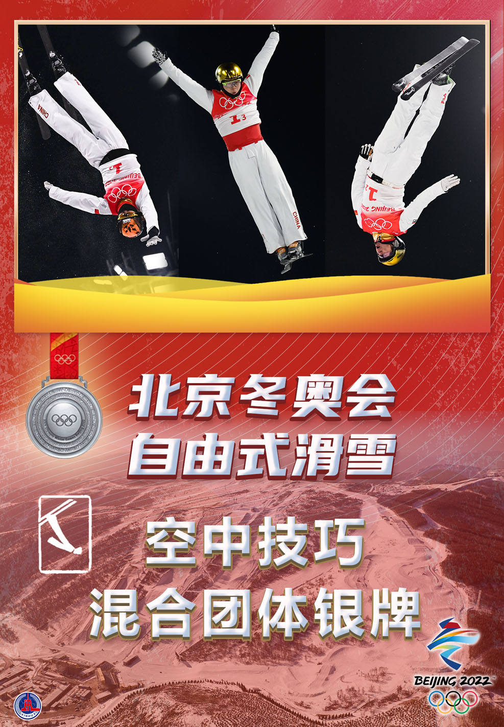 海報(bào):中國(guó)隊(duì)獲自由式滑雪空中技巧混合團(tuán)體銀牌