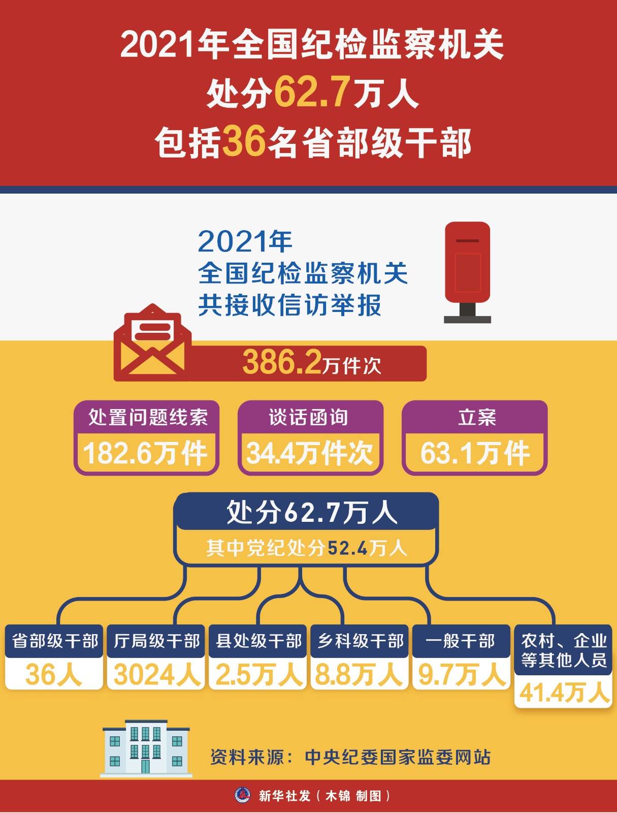 中央紀(jì)委國家監(jiān)委網(wǎng)站1月21日消息,中央紀(jì)委國家監(jiān)委通報(bào)2021年全國紀(jì)檢監(jiān)察機(jī)關(guān)監(jiān)督檢查審查調(diào)查情況。2021年,全國紀(jì)檢監(jiān)察機(jī)關(guān)共接收信訪舉報(bào)386.2萬件次,立案63.1萬件,處分62.7萬人,包括省部級干部36人,廳局級干部3024人。