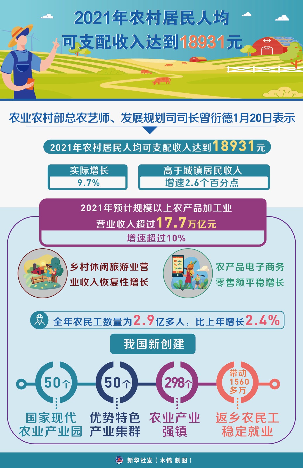 農(nóng)業(yè)農(nóng)村部總農(nóng)藝師、發(fā)展規(guī)劃司司長曾衍德1月20日表示,2021年農(nóng)村居民人均可支配收入達(dá)到18931元,實(shí)際增長9.7%,高于城鎮(zhèn)居民收入增速2.6個百分點(diǎn)。