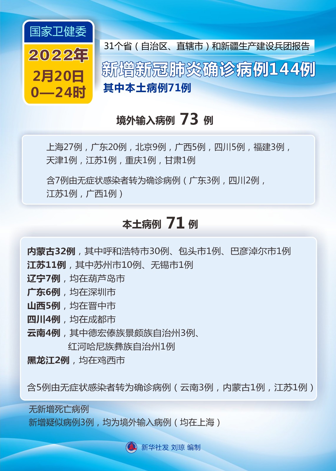 圖表:國家衛(wèi)健委:2月20日新增新冠肺炎確診病例144例 其中本土病例71例