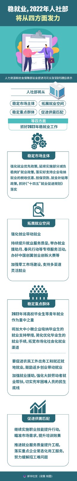 人力資源和社會保障部就業(yè)促進(jìn)司司長張瑩2月22日表示,人社部將從穩(wěn)定市場主體、拓展就業(yè)空間、穩(wěn)定重點群體、促進(jìn)供需匹配等四方面抓好2022年穩(wěn)就業(yè)工作。
