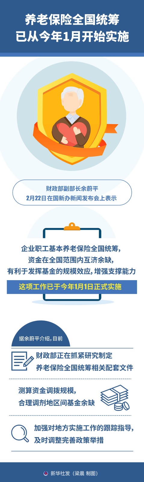 財政部副部長余蔚平2月22日在國新辦新聞發(fā)布會上表示,企業(yè)職工基本養(yǎng)老保險全國統(tǒng)籌,資金在全國范圍內(nèi)互濟余缺,有利于發(fā)揮基金的規(guī)模效應,增強支撐能力。這項工作已于今年1月1日正式實施。