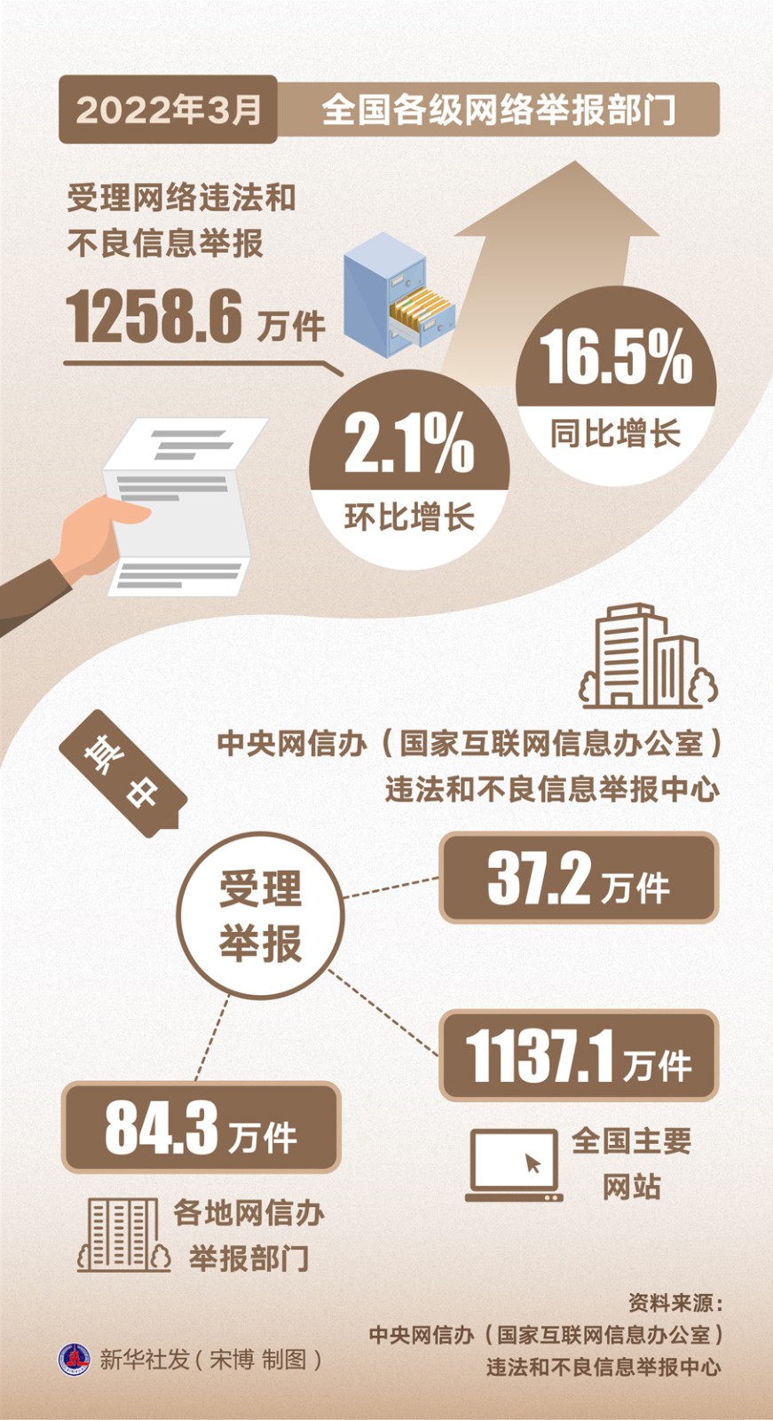 中央網(wǎng)信辦(國家互聯(lián)網(wǎng)信息辦公室)違法和不良信息舉報中心近日公布的統(tǒng)計數(shù)據(jù)顯示,今年3月,全國各級網(wǎng)絡舉報部門受理舉報1258.6萬件,環(huán)比增長2.1%、同比增長16.5%。
