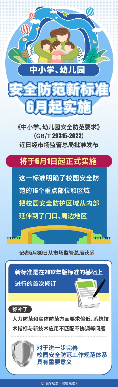 《中小學(xué)、幼兒園安全防范要求》(GB/T 29315-2022)近日經(jīng)市場監(jiān)管總局批準(zhǔn)發(fā)布,將于6月1日起正式實(shí)施。這一標(biāo)準(zhǔn)明確了校園安全防范的16個重點(diǎn)部位和區(qū)域,把校園安全防護(hù)區(qū)域從內(nèi)部延伸到了門口、周邊地區(qū)。