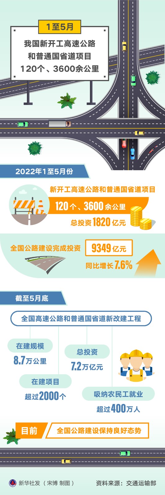 “今年1至5月份,新開工高速公路和普通國省道項(xiàng)目120個、3600余公里,總投資1820億元。”交通運(yùn)輸部副部長趙沖久說。