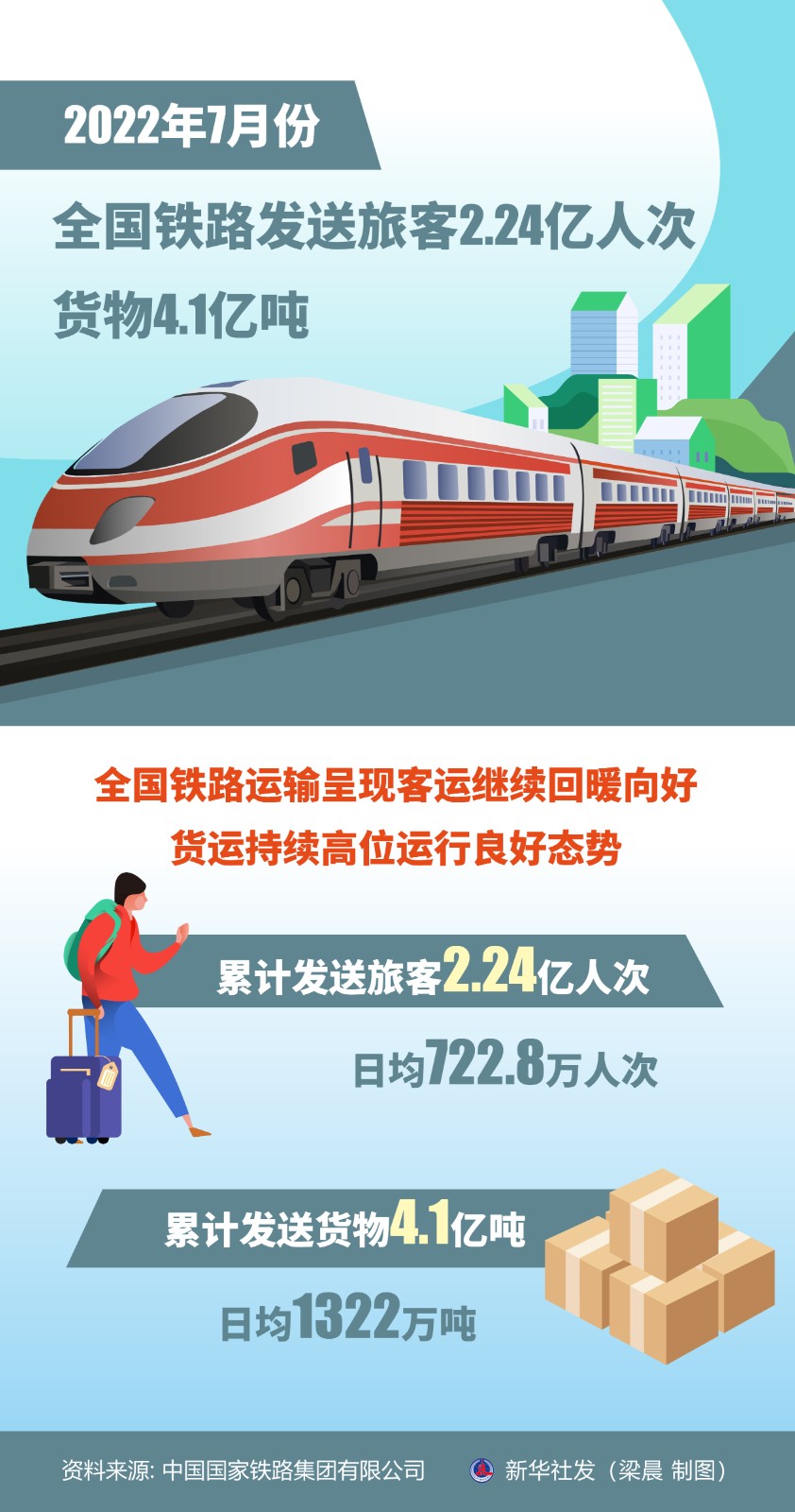 記者8月1日從中國(guó)國(guó)家鐵路集團(tuán)有限公司獲悉,7月份,全國(guó)鐵路運(yùn)輸呈現(xiàn)客運(yùn)繼續(xù)回暖向好、貨運(yùn)持續(xù)高位運(yùn)行良好態(tài)勢(shì),累計(jì)發(fā)送旅客2.24億人次,日均722.8萬(wàn)人次;累計(jì)發(fā)送貨物4.1億噸,日均1322萬(wàn)噸。