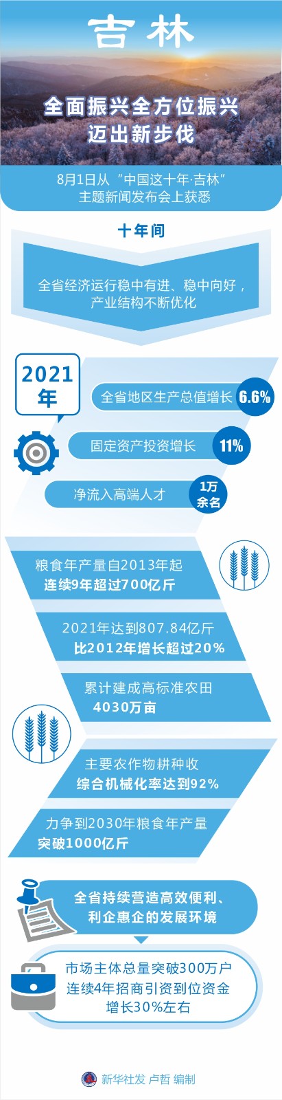 記者從8月1日舉行的“中國這十年·吉林”主題新聞發(fā)布會上了解到,10年間,吉林全省經濟運行穩(wěn)中有進、穩(wěn)中向好,產業(yè)結構不斷優(yōu)化,全省糧食年產量連續(xù)跨上700億斤、800億斤臺階,營商環(huán)境持續(xù)改善,全面振興全方位振興邁出新步伐。