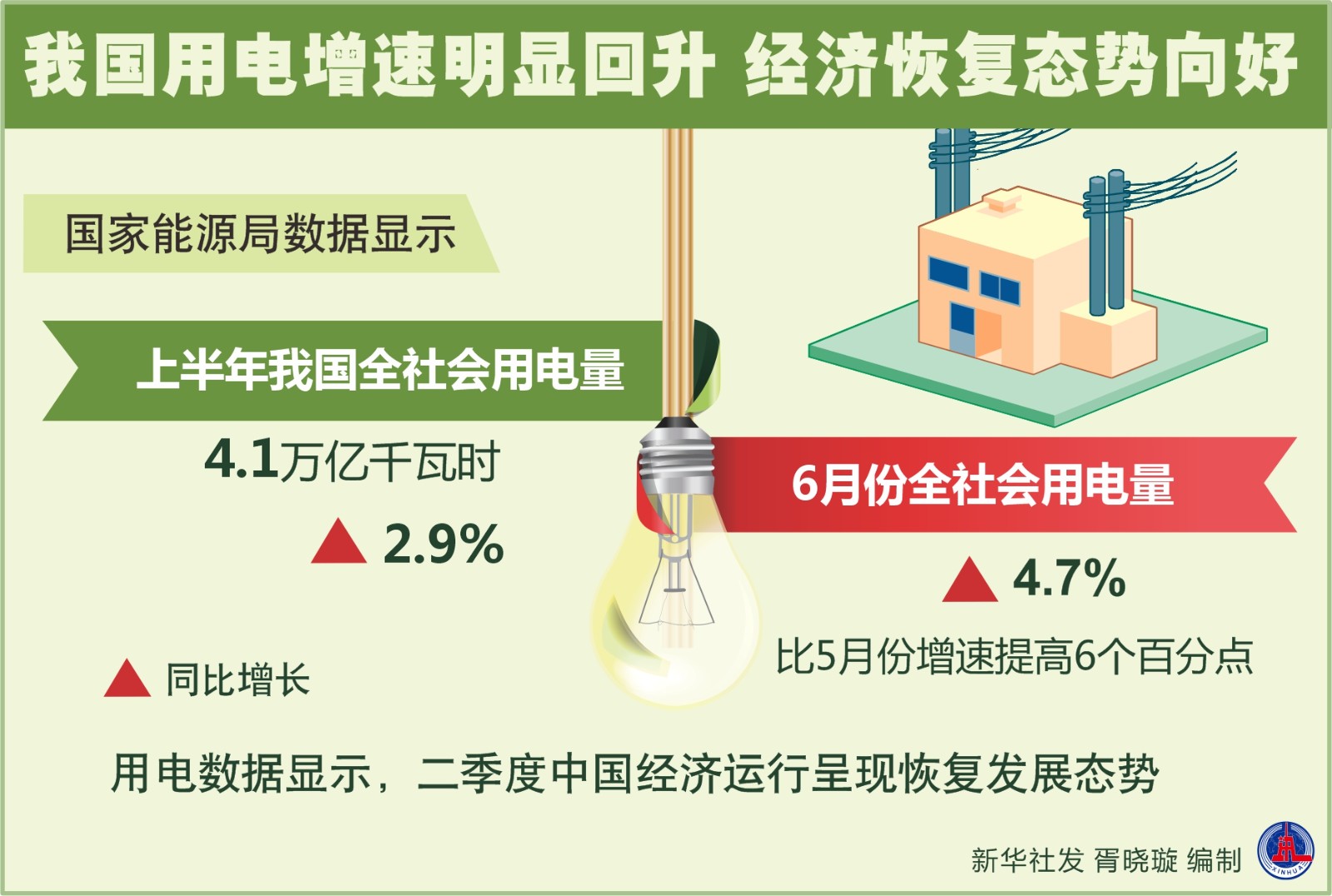 國家能源局數(shù)據(jù)顯示,上半年我國全社會用電量4.1萬億千瓦時,同比增長2.9%。6月份全社會用電量同比增長4.7%,比5月份增速提高6個百分點。用電數(shù)據(jù)顯示,二季度中國經濟運行呈現(xiàn)恢復發(fā)展態(tài)勢。