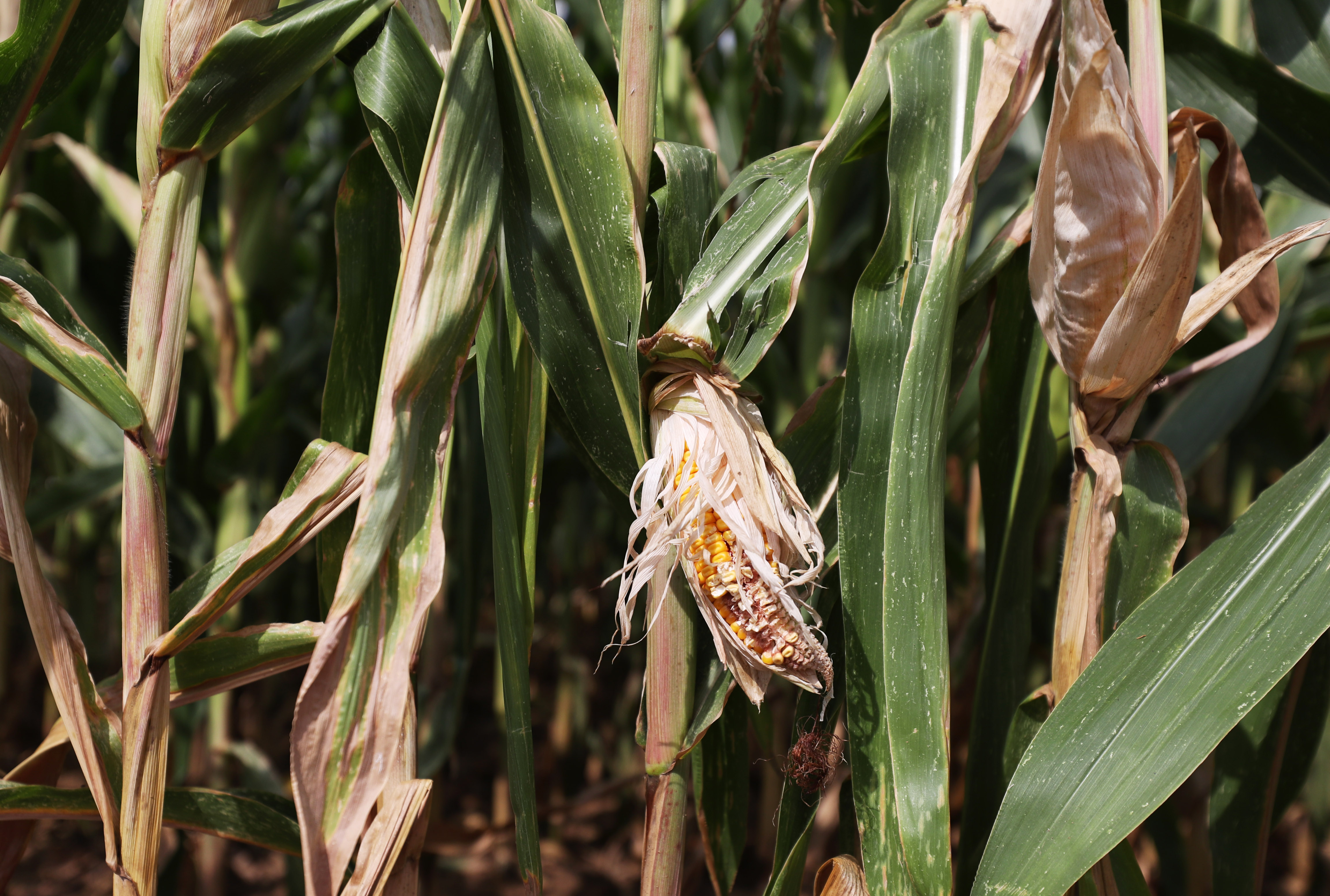 這是8月18日在法國(guó)巴黎西北約30公里處的皮伊塞-蓬圖瓦茲拍攝的受旱情影響的玉米田。