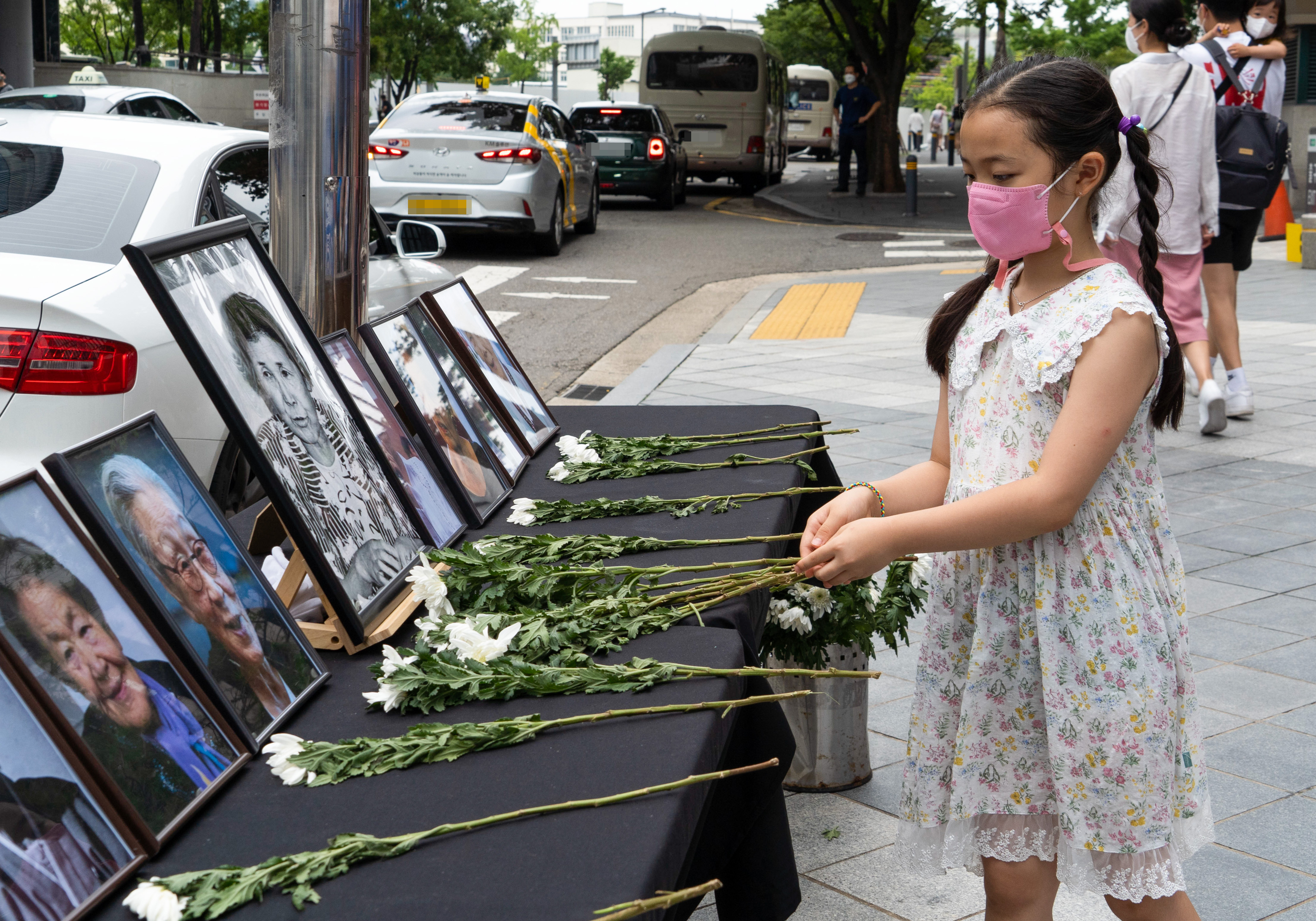 8月14日,在韓國首爾舉行的日軍“慰安婦”受害者紀念日活動上,一名兒童在“慰安婦”受害者的照片前獻花。