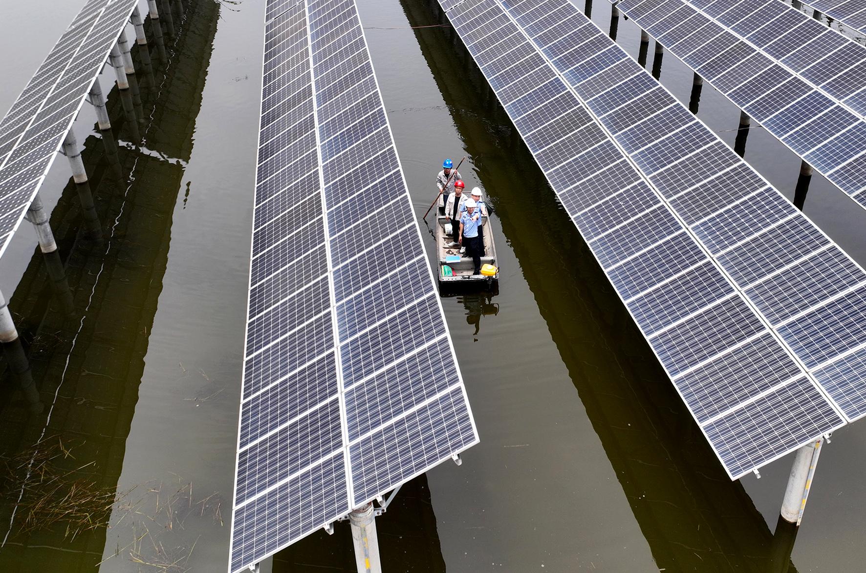 6月25日,江蘇省寶應縣公安局柳堡派出所民警和電站工作人員一起對“漁光互補”光伏電站水面進行安全巡查。隨著氣溫持續(xù)升高,寶應縣公安局柳堡派出所組織民輔警和網(wǎng)格員成立巡查小分隊,對轄區(qū)9500余畝的“漁光互補”光伏電站進行安全巡查,同時開展夏季安全防范宣傳。
