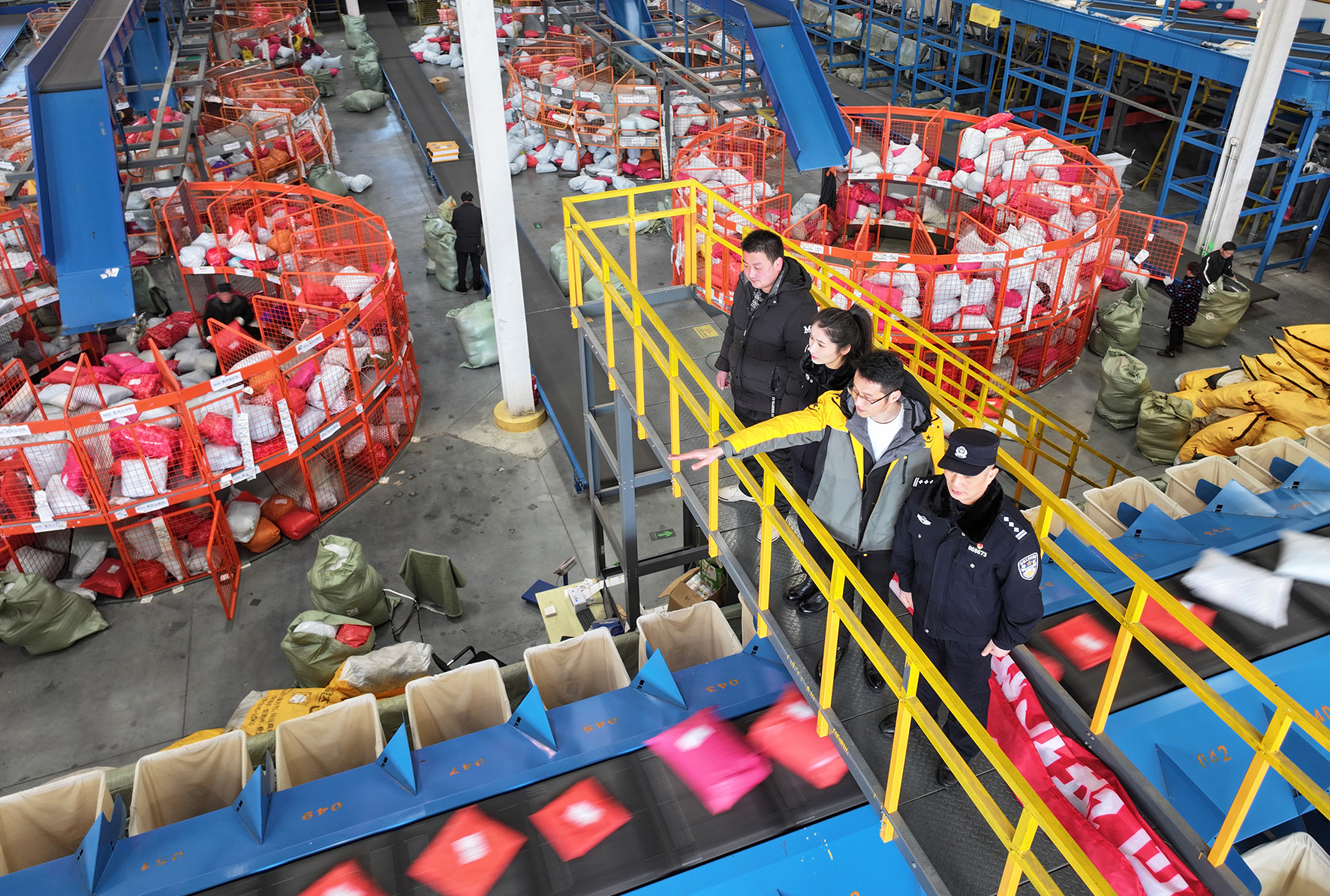 1月23日,在江蘇省南通市海門區(qū)三星鎮(zhèn)深國(guó)際·疊石橋現(xiàn)代國(guó)際物流園區(qū),海門區(qū)公安局“企無(wú)憂”服務(wù)隊(duì)民警走進(jìn)分揀中心,了解安全生產(chǎn)情況,宣傳寄遞業(yè)相關(guān)法律。